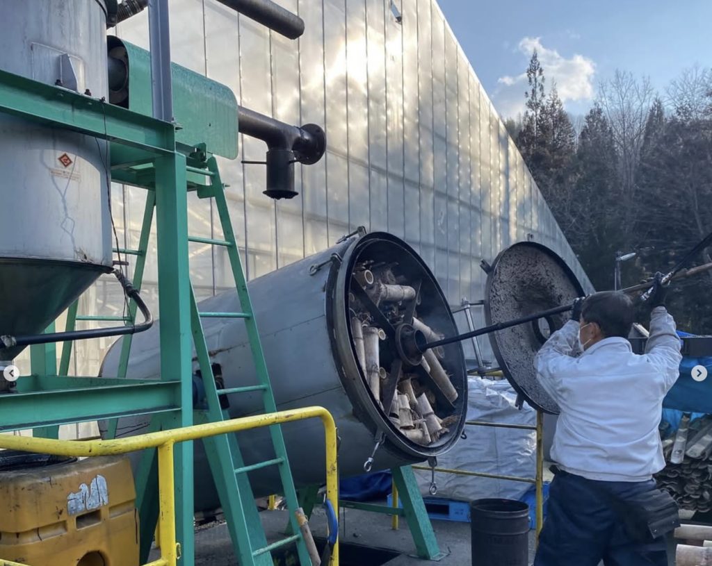 竹炭とは、竹を高温で焼いて炭化させた天然素材です。The farm 12のファクトリーでは、炭化装置(自燃式)を使い一度の釜焼き竹400キロから竹炭100kg、竹酢液約60Lができます。一切の燃料はいらず種火を入れてから約17時間で竹炭が完成するという自燃式で特許を取得しています。