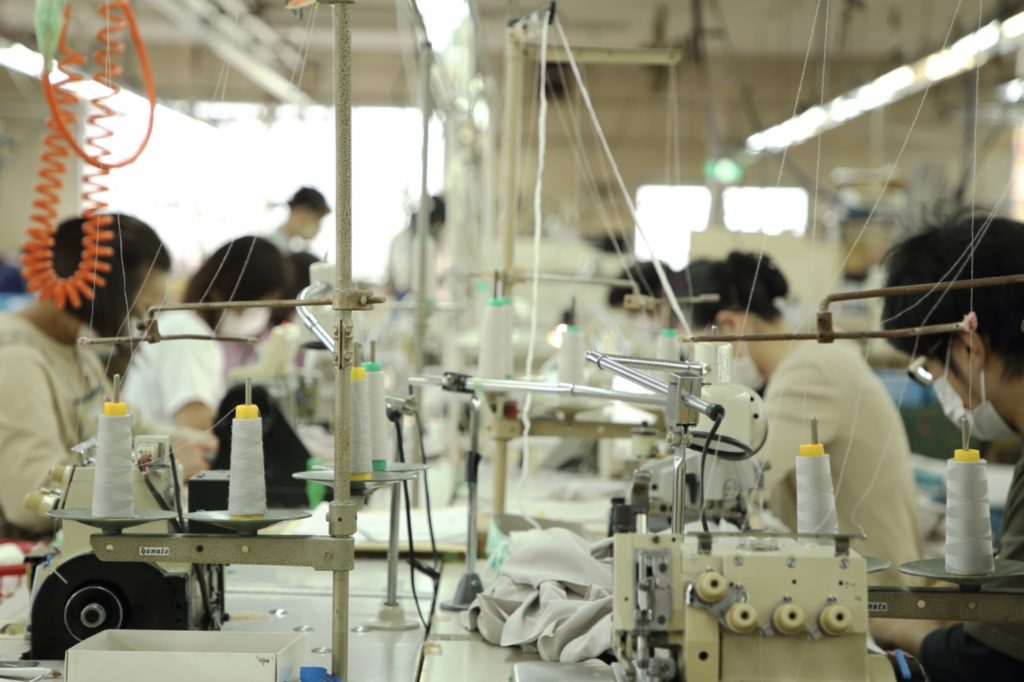 生地は遠州織物の榛地(しんち)織物工場のものを使用しています。あらかじめ糸を染めてから織る「先染織物」を製造しており、色持ちの良さと深みのある色合いが特徴です。縫製はアウトドアウェアや国内ハイブランドの服も手掛けるハイテックというファクトリーで高い技術力を持つ縫製工場です。CADでパターンを作成し、生地を裁断してアイロンをかけ、丁寧に縫製しています。