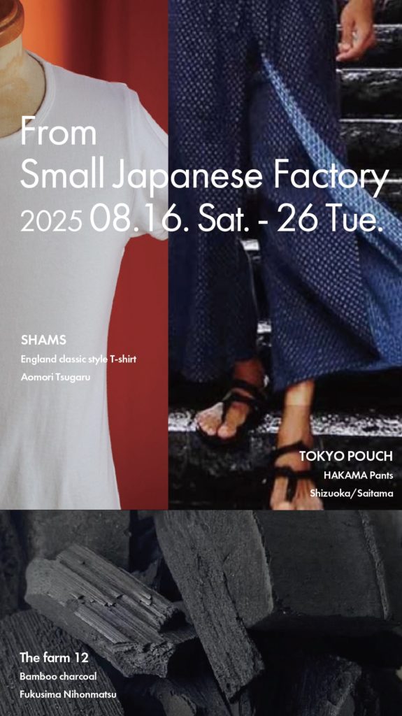 | 日本の小さな製造所で商品を作っている3ブランドの合同展示会を開催いたします。 TOKYO POUCH (HAKAMA Pants) x SHAMS (England classic style T-shirt) x The farm 12 (Bamboo charcoal) 日本の伝統生地を現代のライフスタイルに落とし込んだハカマパンツ、生地とパターンにこだわり抜いたイングランドクラシックTシャツ、そして里山再生から生まれた竹炭アイテムをご紹介します。 各ブランドがこだわる素材と知識、そしてモノ作りへの思いを感じていただける機会となります。 大量生産、海外生産が進み日本国内での生産が厳しくなっていく中、たくさんの技術や知識が消えてしまいそうになっています。それは時代の移り変わりとともに淘汰されていくものかもしれません。それでも抗って残していこうとする彼らがいます。現代のライフスタイルに溶け込んで気持ちよく暮らしていけるように、日本の小さな製造所で作られている特別な想いの詰まったアイテムです。 ぜひお手にとってリアルに肌触り、質感など感じてただきたいアイテムです。 期間中は竹炭を使って育てた玉葱とジャガイモを使ったスープとポテサラをご用意する予定です!ぜひ味わってみてください。 皆様のご来場を心よりお待ちしております。 会 期: 2025年 8月 16日 (土) ~ 8月 26日 (火) 定休日: 20(水)、21(木) 時 間: 12:00 ~ 22:00 日曜 19:00 close 会 場: Little TAO 住 所: 目黒区中目黒3-1-4 #102 THE GARAGE 内 伝統生地を使ったハカマパンツ | TOKYO POUCH TOKYO POUCHが手がけるアジアのスタイルを取り入れた「ミャンマーパンツ」をベースに日本の伝統織物で作ったライン「HAKAMA PANTS」の第四弾2025年は遠州織物の「遠州刺し子」(Makuakeで生産工程など詳しい解説をご覧いただけます。)ユニセックスで制作していますので身長と幅でサイズを選んでいただくことができます。 遠州織物は産地の規模が縮小していく中、大量生産ではなく高付加価値の素材開発に注力し、現在も熟練の職人の手によって昔ながらの織機を使い卓越した技術を駆使して作られ、その質感と風合いは他にはない独特のものとなっています。 使い込むほどに味わい深く、デニムのようにエイジングが楽しめる「HAKAMA PANTS」です。 イングランドクラシックスタイル Tシャツ | SHAMS 媚びないシャツを作り続けているSHAMS が作る細部にまでこだわり抜かれた、England classic style T-shirt。SHAMS笹岡氏が愛してやまないイギリスの40年代製のTシャツを日本の縫製工場で復刻した、初のオリジナルTシャツです。こちらもユニセックスでご紹介しております。 触り比べる事に数ヶ月を費やし決めた生地は、ザラっとした触感で少しのネップが感じられるモノです。 パターンは丸胴ではなく脇に接ぎ目が入る前身頃と後ろ身頃を縫い合わせた、正に和製英語のカットソー(cut&sew)スタイルです。試作を繰り返したこだわりの袖口と首周りのパイピング細幅2本ステッチは東京ピオの青森ファクトリーで縫製し、ネームタグには-MADE IN AOMORI-を刻みました。メイドインジャパンの確かな技術とプライドを持ち丁寧に洋服を作っているカンパニーです。 このEngland classic style T-shirt は生地の性質も実にクラシックだそうで、洗うと縮みます!こちらもデニムのように育てがいがありそうですね。ウォッシュした状態のサンプルもご用意してお待ちしております。 竹炭 | The farm 12 The farm 12 のはじまりは里山の再生です。2022年、その荒れた放置竹林を整備し里山の再生に取り組みたいという思いから、二本松市で竹炭づくりをスタートします。 竹は成長が早くしなやかで、生活道具として日本の暮らしの中にありました。そして竹を焼くと竹炭や竹酢液をつくることができ、土壌改良、浄化、消臭など様々な使い道があります。 竹炭は、湿気取り 調湿効果があり、押入れやクローゼットに入れるとカビの抑制にもなり衣類をまもってくれます。また靴の中にいれて収納したり、冷蔵庫、トイレ、ペットのトイレにも臭いの軽減になります。水の浄化、炊飯、鉢植えや家庭菜園の土に混ぜると通気性や保水性を向上させ肥料持ちがよくなるなどなど!効能はたくさんあります。竹酢も消臭、除菌、掃除、入浴、防虫、害虫忌避、土壌改良、ペット周りの清掃、虫除け、虫刺され、土壌改良・観葉植物の病気予防、家庭菜園とよいことだらけです! だまされたと思ってぜひ試してみてくださいね。 Little TAO_Tsuneda —————- Thanks for reading ! Have a good day! See you next issue. CONTACT |