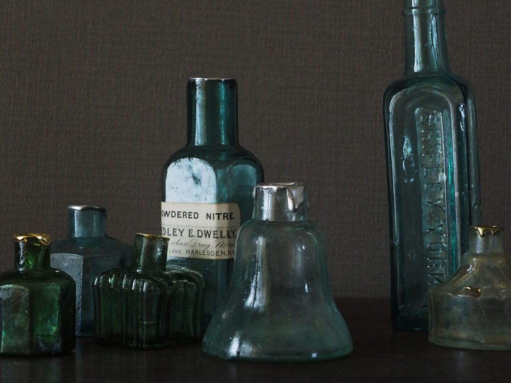 型を使ってはいるけれど手作業で製造がまだ行なわれていた時代。気泡が入っていたり曲がっていたり。表情が一つ一つ違って唯一無二。インク瓶、薬、ソース、オイルと表記があり当時の暮らしぶりを想像するのも楽しい。
