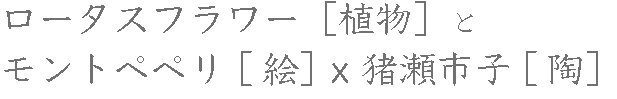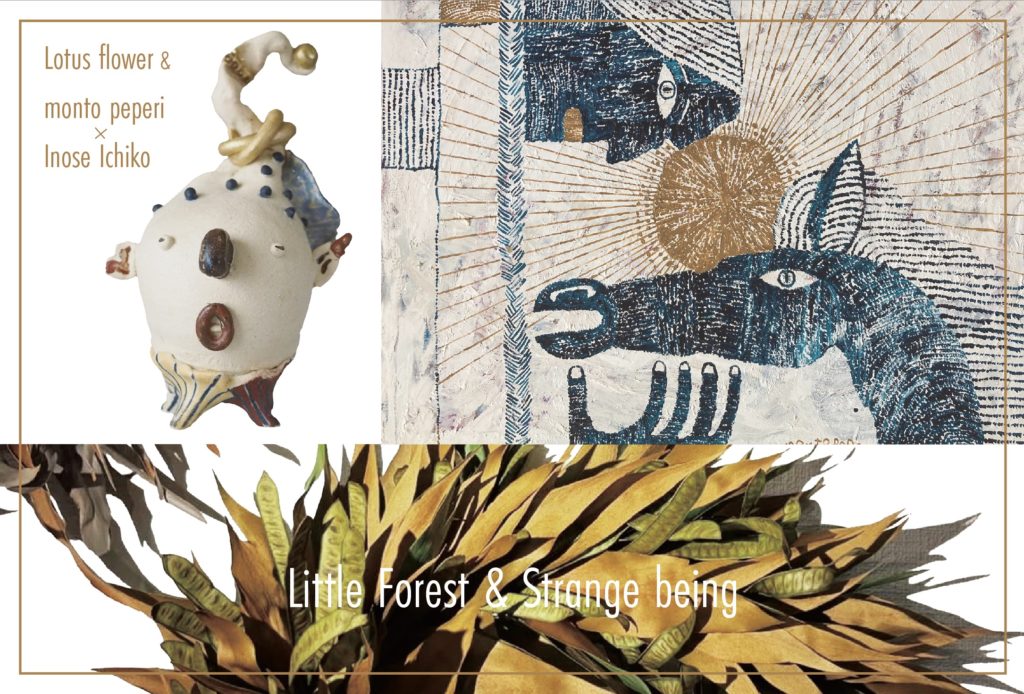 ロータスフラワーは、実在の不思議な植物をつかった森の断片のようなリースやスワッグで「小さな森」を創り。 モントぺぺリは、北国の動物や、物語のなかのワンシーンのような、壁画のような絵の中に「奇妙な存在」を描き。 猪瀬市子は、奇妙なカタチの植物か、動物か、実在するものかわからない「奇妙な存在」を陶器で焼き上げる。それぞれ違った素材から紡ぎ出される物語がひとつの空間で交わります。