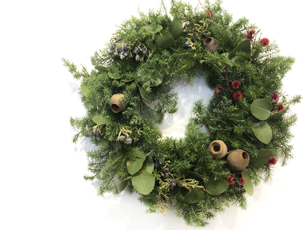 コニファー、ブルーアイス、ジュニパーベリー、ユーカリ、オリーブなど色々な種類のグリーンをベースに作ります。赤い実やナッツを添えて、小さな森をお部屋に。森の香りがとても爽やかです。